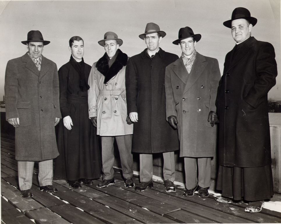 | Une sortie au Collège des Jésuites de Québec au début des années 50. On reconnait de gauche à droite, Bob Filion, un séminariste du collège, Léo, Maurice Richard, Normand Dusseault et le Père Péloquin |