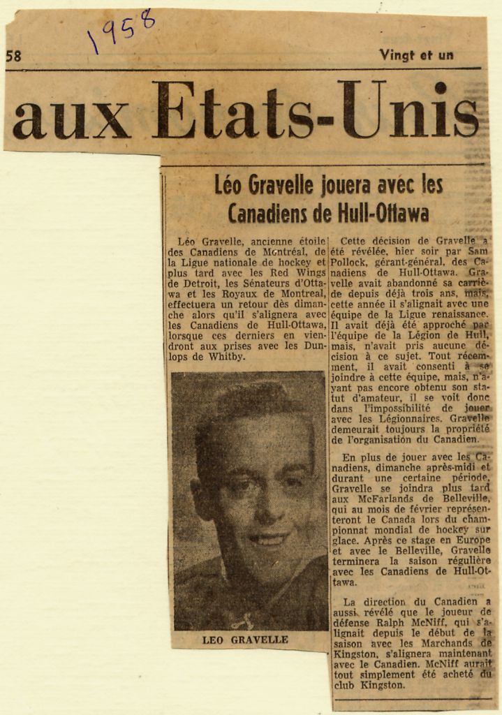 Léo Gravelle jouera avec les Canadiens de Hull-Ottawa - 1958